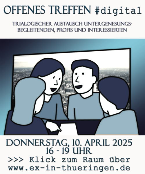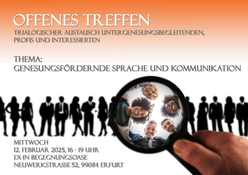 Die Offenen Treffen hingegen sind trialogisch konzipiert. Hier sind zusätzlich zu den EX-INlern auch Betroffene, Angehörige, Profis und alle, die sich für EX-IN interessieren, herzlich eingeladen.